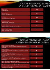 “Sebagai juri kami sangat mengapresiasi para peserta yang begitu inovatif. Banyak ide-ide cemerlang yang dimunculkan, sehingga sangat sulit bagi kami untuk menentukan siapa yang paling terbaik. Semoga inovasi yang keluar sebagai pemenang, bisa memberikan kontribusi positif bagi daerah yang sama-sama kita cintai ini,” katanya.