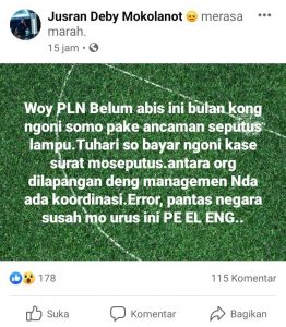 “Woy PLN belum abis ini bulan, kong ngoni somo pake ancaman seputus lampu (Hai PLN, belum habis bulan ini, terus kalian sudah pakai ancaman untuk melakukan pemutusan listrik.red),” tulisnya pada akun facebook Jusran Deby Mokolanut.
