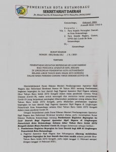 Edaran itu juga menegaskan apabila ASN yang dalam keadaan terpaksa perlu untuk melakukan kegiatan bepergian ke luar daerah pada periode tersebut, maka yang bersangkutan harus terlebih dahulu mendapat izin tertulis dari Wali Kota Kotamobagu.