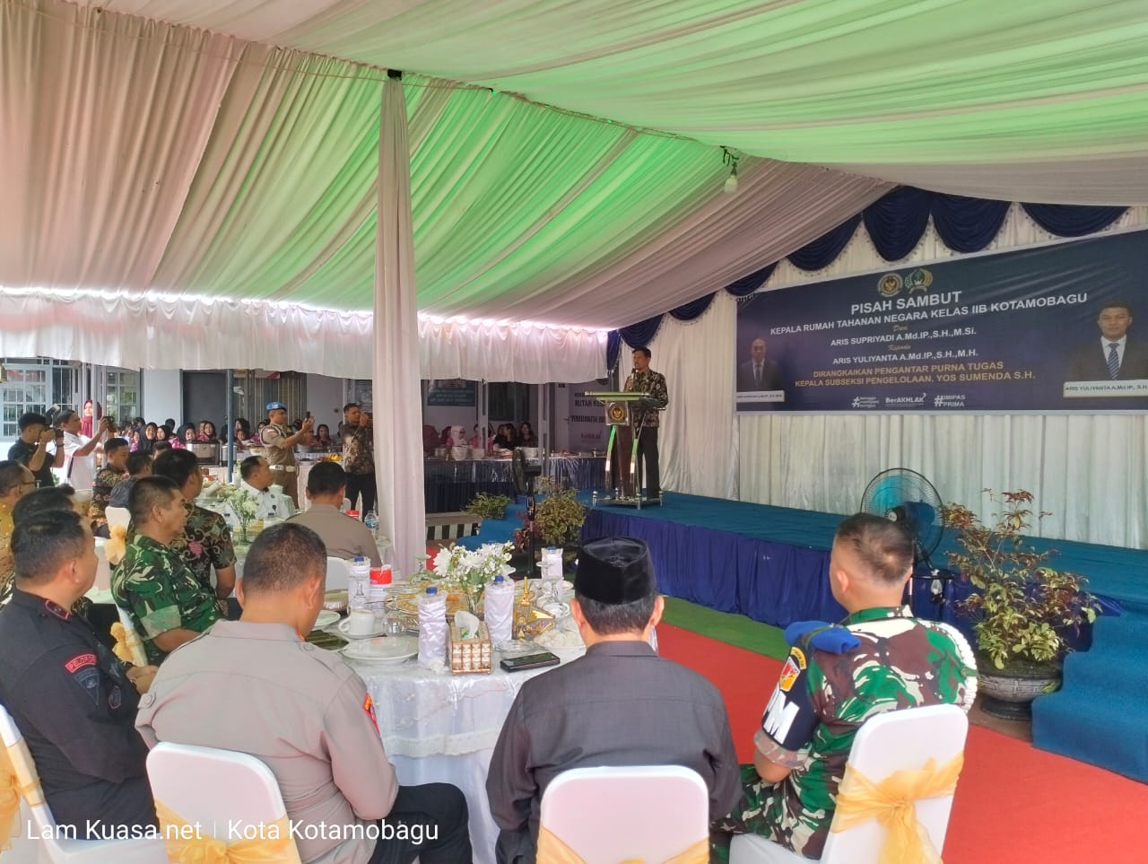 Acara yang berlangsung di halaman Rutan Kotamobagu tersebut menjadi momentum serah terima jabatan dari Kepala Rutan sebelumnya, Aris Supriyadi, kepada pejabat baru, Aris Yuliyanta. Selain itu, kegiatan ini juga dirangkaikan dengan pengantar purna tugas Kepala Subseksi Pengelolaan, Yos Sumenda.