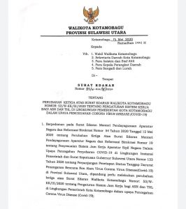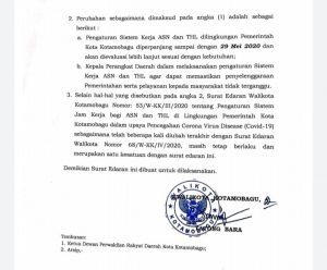 Penyesuaian jam kerja tersebut berdasarkan Surat Edaran Wali Kota Kotamobagu nomor 89/W-KK/V/2020 tertanggal 13 Mei 2020 tentang perubahan ketiga atas surat edaran Wali Kota Kotamobagu nomor : 53/W-KK/III/2020 tentang pengaturan sistem kerja bagi ASN dan THL dilingkungan Pemkot Kotamobagu dalam upaya pencegahan Covid-19.