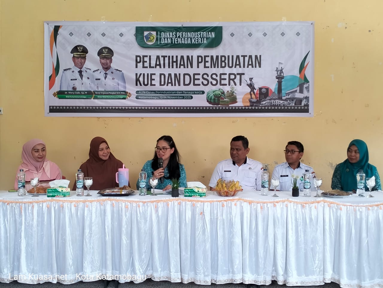 KOTAMOBAGU — Wakil Ketua Tim Penggerak Pemberdayaan dan Kesejahteraan Keluarga (TP-PKK) Kota Kotamobagu, Resty A. Mangkat Somba secara resmi membuka kegiatan Pelatihan Pembuatan Kue dan Dessert, yang digelar di Aula Kantor Dinas Perindustrian dan Tenaga Kerja Kota Kotamobagu, Rabu (12/11/2025).
