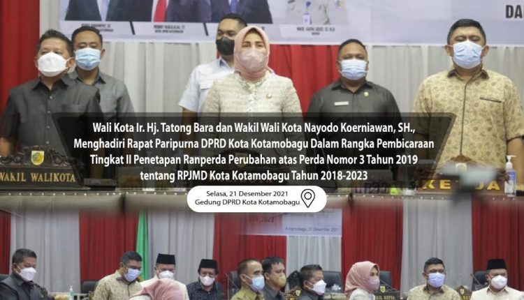Kuasa.NET, KOTAMOBAGU – Wali Kota Kotamobagu, Tatong Bara, didampingi Wakil Wali Kota, Nayodo Koerniawan menghadiri rapat paripurna Dewan Perwakilan Rakyat Daerah (DPRD) Kotamobagu, Selasa (21/12/2021)