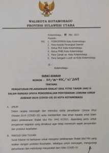 Kuasa.NET, KOTAMOBAGU – Wali Kota Kotamobagu, Tatong Bara, menerbitkan Surat Edaran (SE) nomor: 60/W-KK/V/2021 tentang pengaturan pelaksanaan salat Idul Fitri 1442 Hijiriah dalam rangka upaya pengendalian Covid-19, tertanggal 11 Mei 2021.