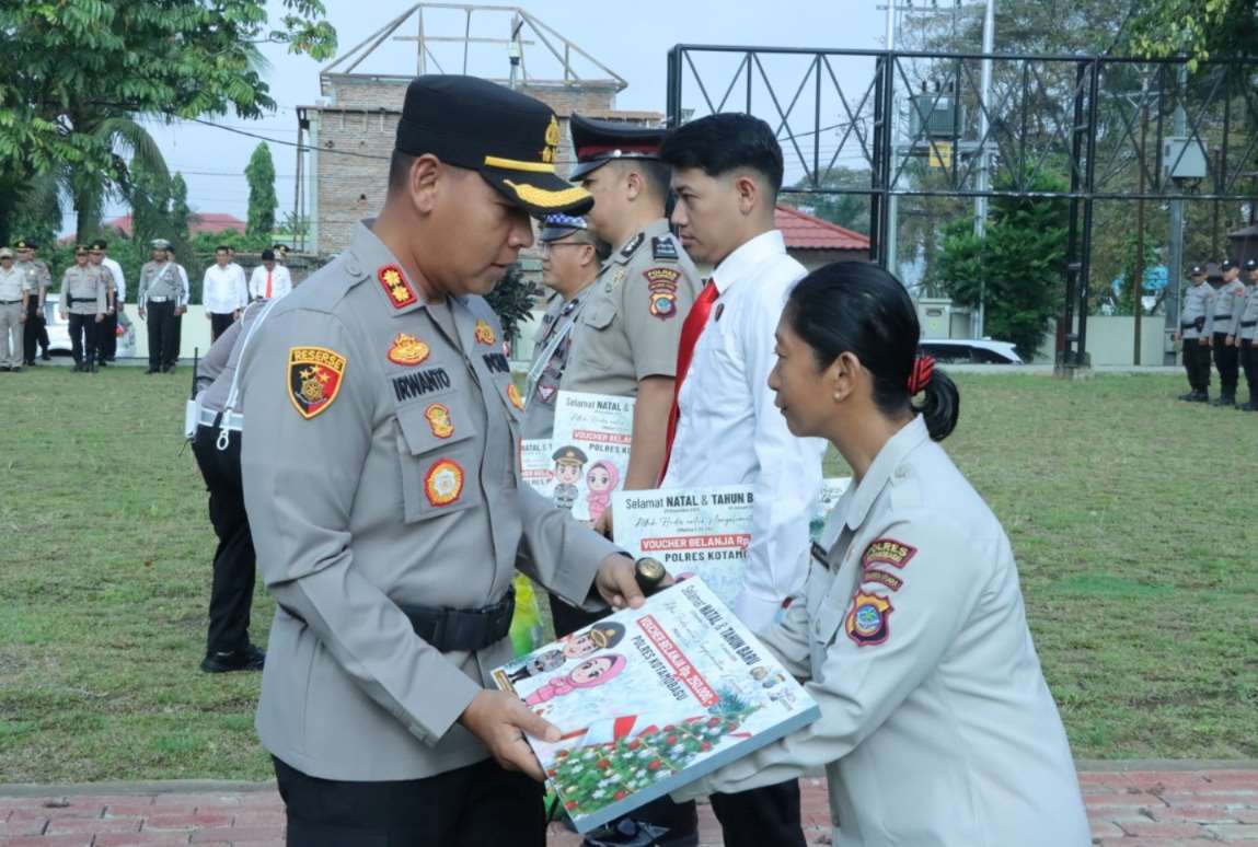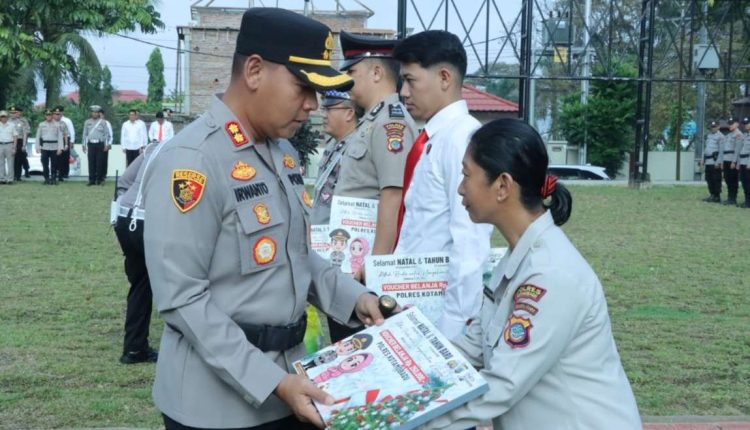Pembagian bingkisan Natal diserahkan langsung Kapolres dalam apel yang digelar di halaman Mako Polres setempat, Senin (15/12/2025).